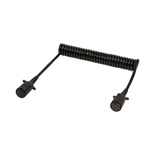 Premium spiral electric cable “N” with two 7-pin overmolded plugs compliant with ISO 1185, dedicated to the electrical systems of trucks and trailers, ensuring reliable signal transmission and maintaining the highest standards of safety and durability even in the most demanding road conditions; also available in ECONOMIC version; technical data: working length 3.0 m, maximum length 3.5 m, 7 pins, core cross-section 6×1.0 + 1×1.5 mm², standard ISO 1185, quality Premium, plug type overmolding, connector type “N”.