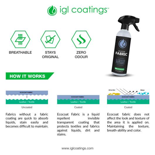 Ecocoat Fabric is a liquid repellent invisible transparent waterproof -ing coating that protects all porous surfaces, in particular, textiles and fabrics against liquids, dirt and stains. A water based zero VOC nano-technology super hydrophobic transparent coating designed for busy individuals just like you.