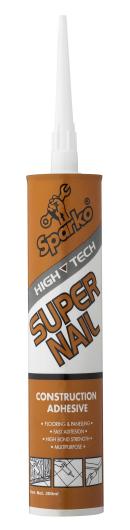 Sparko SUPER NAIL CONSTRUCTION ADHESIVEA gunable contact type adhesive that will not slump on vertical surfaces. It been formulated to bond to a variety of common construction materials. It can be use with wood, plastered wood, particleboard, masonry, aluminum, galvanized iron, steel, fber cement sheeting, wall, brick, concrete, tiles, floor paneling foamed polystyrene and mirror.