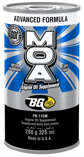 BG Advanced Formula MOA® PN 115M Oil fortifier that keeps piston rings from sticking, stabilizes oil viscosity, prevents increased exhaust emissions, reduces wear, prevents sludge and varnish, and is resistant to evaporative oil loss.